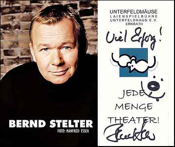 Anläßlich seines Gastspiels in der Erkrather Stadthalle am 30.10.06 trafen die UNTERFELDMÄUSE den aus Film und Fernsehen bekannten Künstler. Im nach der Vorstellung besuchten Stammlokal der Unterfeldmäuse "Erkrather Hof", gleich gegenüber der Stadthalle, hatten sie die Möglichkeit, sich einmal mit Bernd Stelter so ganz von "Künstler zu Künstler" unterhalten zu können. Ein äußerst interessantes und aufschlussreiches Gespräch folgte, das schließlich mit einem Autogramm und besten Wünschen für die weitere Zukunft einen überaus begeisternden Abschluss fand.